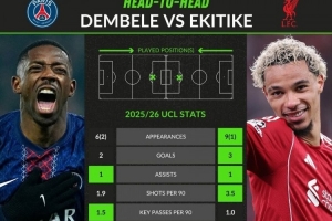 本赛季欧冠关键数据:登贝莱8场2球1助攻,埃基蒂克10场3球1助攻