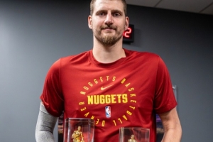 大王的双王!掘金晒约基奇领取助攻王&篮板王奖杯照片