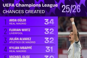 本赛季欧冠创造机会排名: