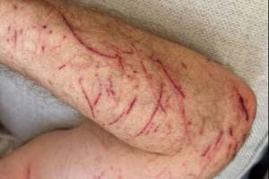 希勒写道:“自行车道上的坑洼可真不好。”图中希勒的手臂和腿部有多处割伤和擦伤。